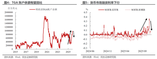 其次,政府重启开门后,前期市场担忧的流动性状况有望进一步改善。由于大量发债以及政府关门,财政部普通账户(TGA)余额从7月的3000亿美元上升至11月的近万亿美元。随着政府结束停摆,前期财政部TGA账户吸收的巨额现金有望部分得到释放,缓解前期市场流动性不足的局面,当前担保隔夜融资利率(SOFR)相对联邦基金利率(EFFR)、超额准备金利率(IORB)的利差也已经明显回落。